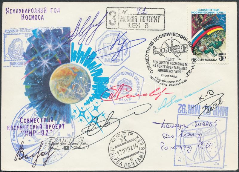 Szergej Avdejev (1956- ), Anatolij Szolovjev (1948- ), Klaus-Dietrich Flade (1952- ), Alekszandr Viktorenko (1947- ), Alekszandr Volkov (1948- ) és Szergej Krikalev (1958- ) űrhajósok aláírásai emlékborítékon / Signatures of Sergei Avdeyev (1956- ), Anatoliy Solovyev (1948- ), Klaus-Dietrich Flade (1952- ), Aleksandr Viktorenko (1947- ), Aleksandr Volkov (1948- ) and Sergei Krikalev (1958- ) astronauts on envelope