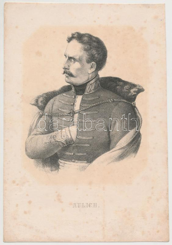 Jelzés nélkül: Aulich Lajos (1793-1849) honvéd vezérőrnagy, az 1848-49-es forradalom és szabadságharc harmadik hadügyminisztere, litho, papír, kissé foltos, 17x12cm