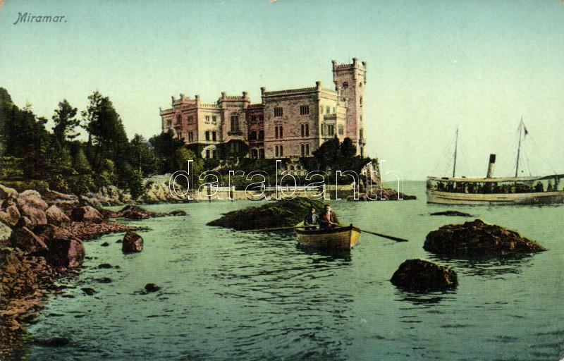 Trieste, Miramar / castle, rowboat, steamship (worn edges) https://www.darabanth.com/de/265-Fernauktion/265.0/Ansichtskarten/Italien~300054/Trieste-Miramar-castle-rowboat-steamship-worn-edges~II1324323