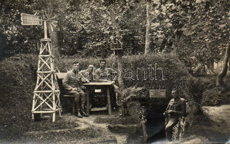 1917 2 db fotó képeslap a frontról a 26. Honvéd Gyalogezredből, sebesült ellátás a lövészárokban és Holdampf hadnagy szállása / 2 postcards from the 26th Hungarian Infantry Regiment, tending to the wounded soldiers, quarters of Lieutenant Holdampf, photo