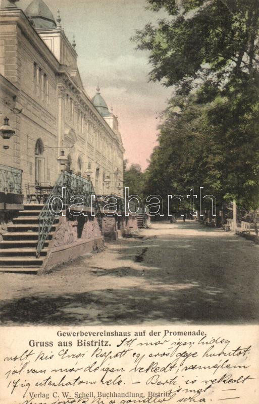 Beschreibung: Beszterce, Bistritz; Gewerbevereinshaus auf der Promenade; Verlag C. W. Schell / chamber of commerce, promenade (EB)