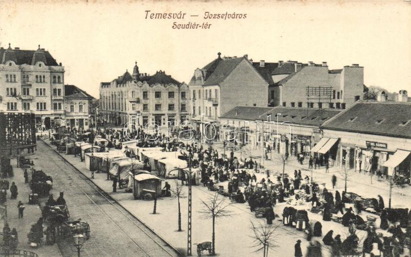Beschreibung: Temesvár, Timisoara; Scudiér-tér, piaci árusok, üzletek, kiadja Feder R. Ferenc / market square, vendors, shops (EK)
