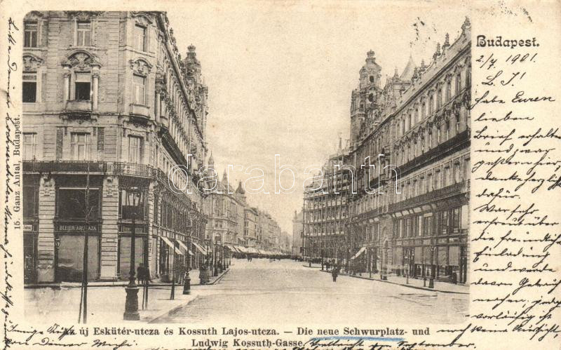 Beschreibung: Budapest V. Eskütér utca és Kossuth Lajos utca, Bleier üzlete, kiadja Ganz Antal (EK)