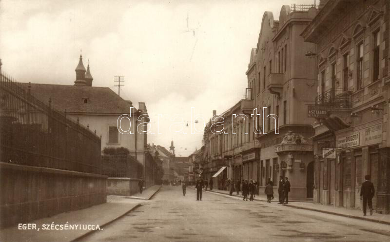 Eger, Szécsényi utca, Papp Testvérek üzlete, Szent Margit Drogéria, Pléh István Asztalos mester, Magyar Általános Hitelbank Egri fiókja, Kardos Sándor üzlete