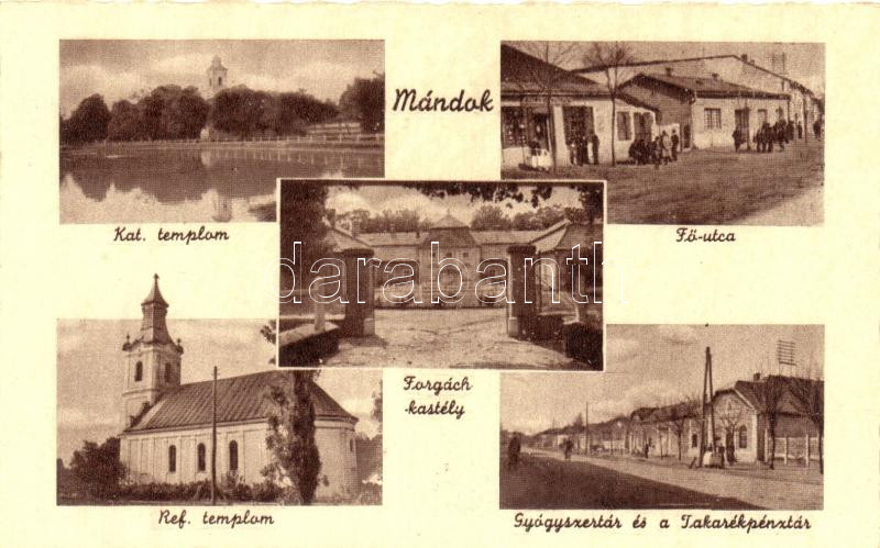 Beschreibung: Mándok, Gyógyszertár és Takarékpénztár, Fő-utca, Katolikus templom, Református templom, Forgách kastély
