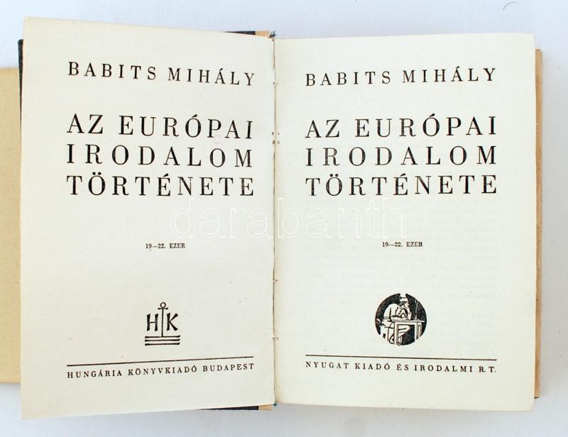 Babits Mihály: Az európai irodalom története. Bp., é.n., Hungária és N... https://www.darabanth.com/de/265-Fernauktion/265.0/Bucher/Bucher-Sonstige-Raritaten~500002/Babits-Mihaly-Az-europai-irodalom-tortenete-Bp-en-Hungaria-es-Nyugat-Kiadoi-felvas~II1322858