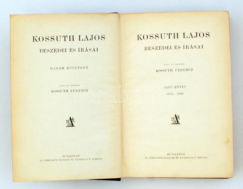 Kossuth Lajos beszédei és írásai I-III. Sajtó alá rendezte: Kossuth Ferencz. Budapest, é.n., Athenaeum. Kissé laza kiadói egészvászon-kötésben, egy kötet gerince sérült.