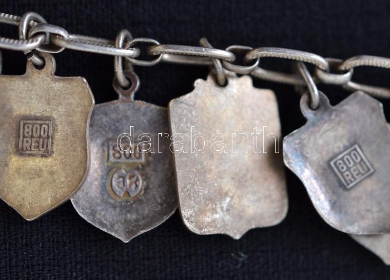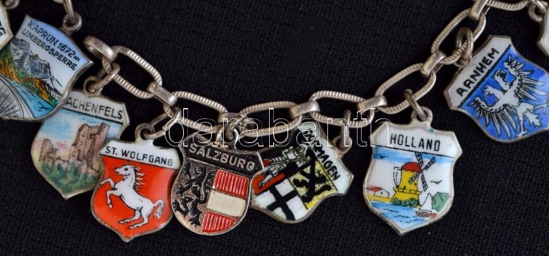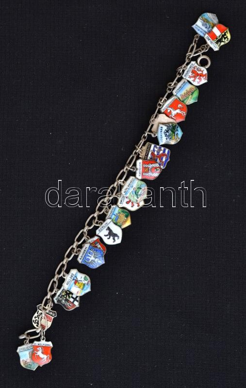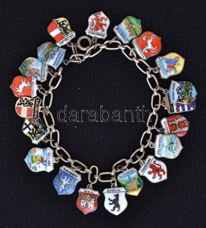 Beschreibung: Díszes ezüst (Ag.) karkötő, rajta zománcberakásos német városcímerekkel (az egyik fém), jelzett, h: 19 cm, bruttó 27 g