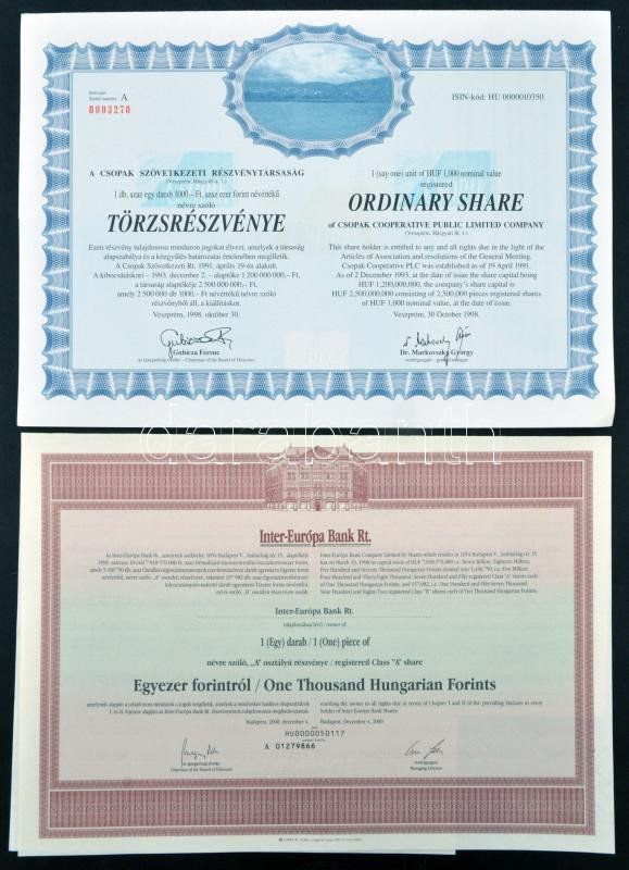 Beschreibung: Veszprém 1998. "A Csopak Szövetkezeti Részvénytársaság" törzsrészvénye 1000Ft-ról szelvényekkel, Budapest 2000. "Inter-Európa Bank Rt." részvénye 1000Ft-ról szelvényekkel T:I,I-