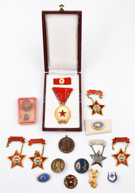 15db-os jelvény és kitüntetés tétel, benne ~1950. "Kiváló Dolgozó" zománcozott, Rákosi-címeres fém kitüntetés, "A Szociális Missziótársulat Ifjúsága" zománcozott fém jelvény, 1938. "Felvidéki Emlékérem - II. Rákóczi Ferenc" Br emlékérem mellszalag nélkül, 1964. "Munka Érdemrend" arany fokozata, aranyozott Br kitüntetés miniatűrrel szalagsávon, eredeti tokban, 1979. "Közös Űrrepülés - 1979" hidegzománcozott fém jelvény T:1-,2,2-