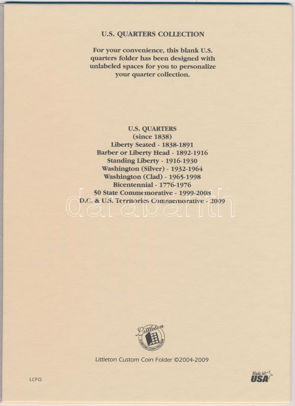 Amerikai Egyesült Államok "U.S. QUARTERS" 43 férőhelyes gyűjtői album használatlan állapotban