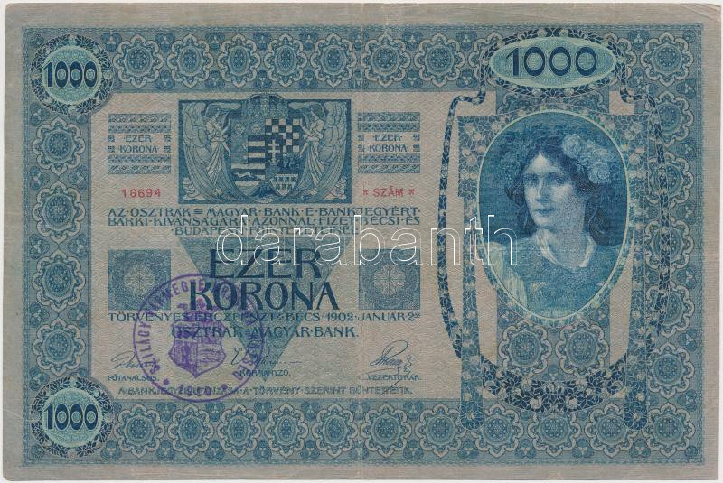 1902. 1000K "Szilágy Vármegye Kraszna Község 1910" felülbély... https://www.darabanth.com/de/265-Fernauktion/265.0/Numismatik/Ungarische-Banknoten~400007/1902-1000K-Szilagy-Varmegye-Kraszna-Kozseg-1910-felulbelyegzessel-TIII-tulyuk~II1326040