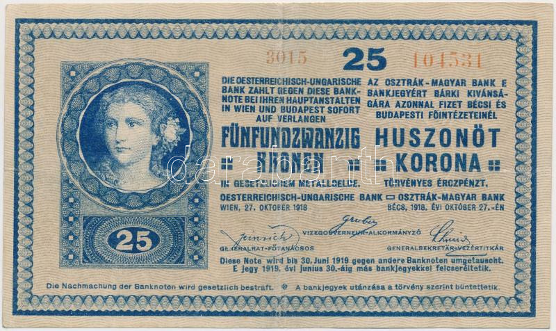 1918. 25K "3015" 3mm, sima hátlappal T:III https://www.darabanth.com/de/265-Fernauktion/265.0/Numismatik/Ungarische-Banknoten~400007/1918-25K-3015-3mm-sima-hatlappal-TIII~II1322062