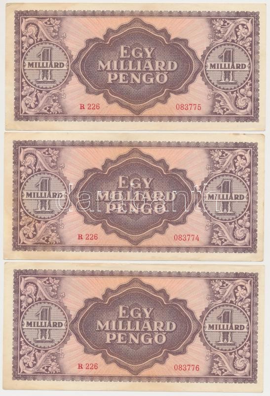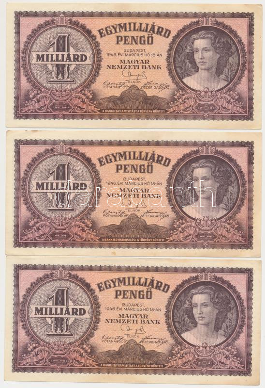 1946. 1.000.000.000P (3x) sorszámkövetők T:I- https://www.darabanth.com/de/265-Fernauktion/265.0/Numismatik/Ungarische-Banknoten~400007/1946-1000000000P-3x-sorszamkovetok-TI-~II1248019