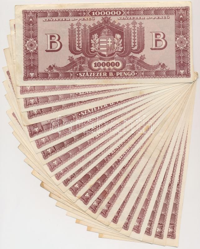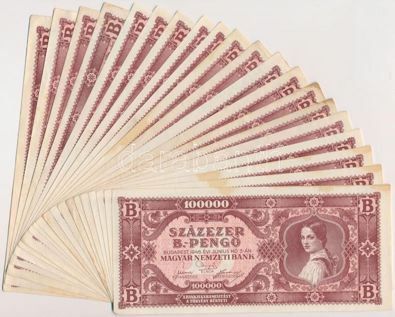 1946. 100.000BP (20x) T:I-,II,III https://www.darabanth.com/de/265-Fernauktion/265.0/Numismatik/Ungarische-Banknoten~400007/1946-100000BP-20x-TI-II-III~II1325323