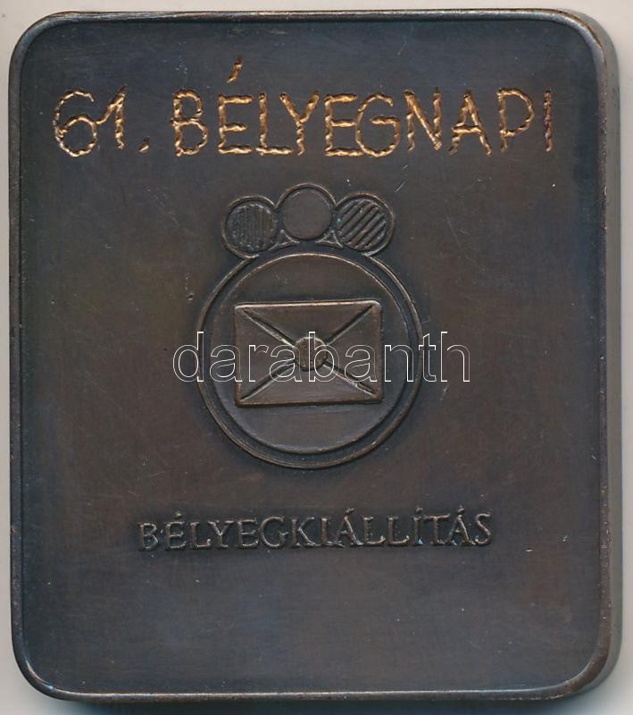Beschreibung: DN "Magyar Bélyeggyűjtők Országos Szövetsége Budapest / 61. Bélyegnapi Bélyegkiállítás" kétoldalas Br plakett (40,5x46,5mm) T:2