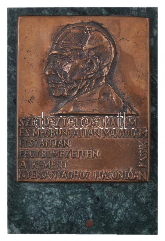 Jovánovics György (1939-) ~1970. "Kassák Lajos - Szétosztottam magam és megbontatlan maradtam elszántan, fegyelmezetten a kemény nyersanyaghoz hasonlóan" Br emlékplakett mesterjegy nélkül, márványlapon (89x111mm) T:2 Hungary ~1970. "Lajos Kassák" commemorativa plaque on marble, unmarked. Artist: György Jovánovics (89x111mm) C:XF