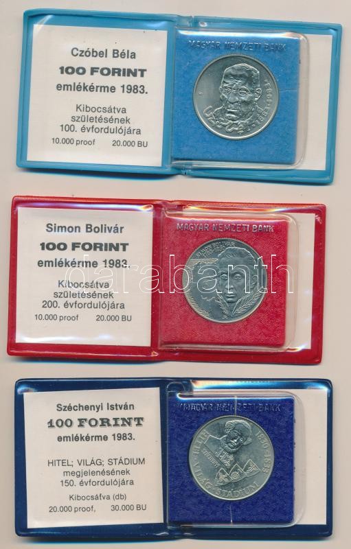 Beschreibung: 1983. 100Ft alpakka "Czóbel Béla" + 100Ft alpakka "Simon Bolivár" + 100Ft alpakka Széchenyi István" mindegyik eredeti tokban (kettő kissé sérült), tanúsítvánnyal T:BU