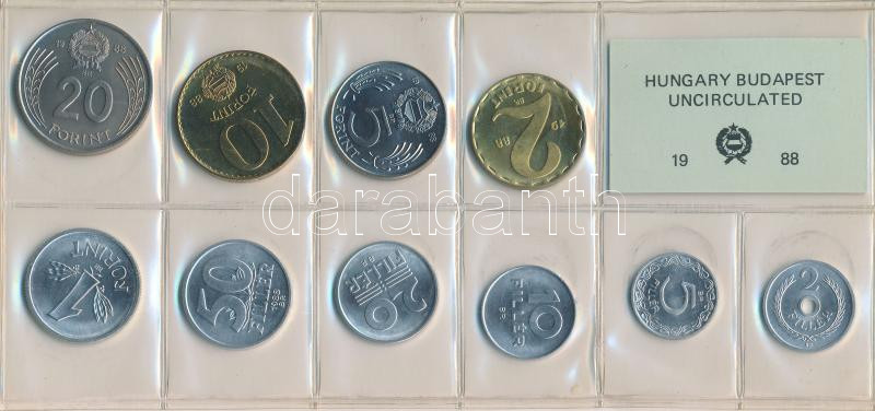 1988. 2f-20Ft 10db klf, érmés forgalmi sor fóliatokban T:1 https://www.darabanth.com/de/265-Fernauktion/265.0/Numismatik/Ungarische-Munzen-und-Munzen-mit-ungarischem-Munzzeichen~400008/1988-2f-20Ft-10db-klf-ermes-forgalmi-sor-foliatokban-T1~II1321999