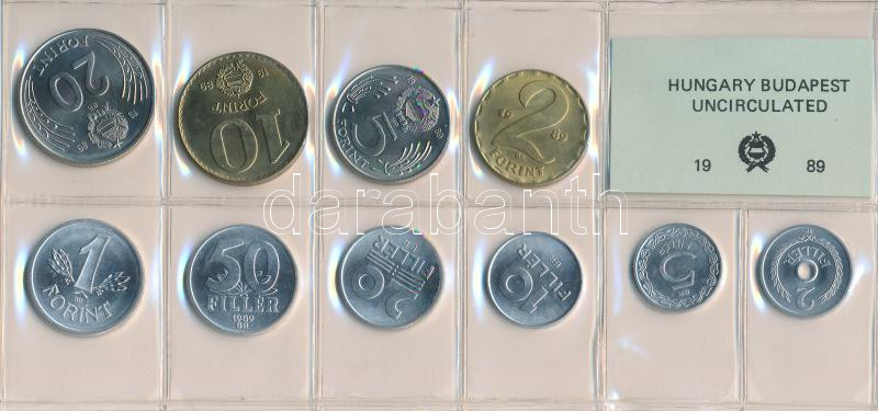 1989. 2f-20Ft 10db klf, érmés forgalmi sor fóliatokban T:1 https://www.darabanth.com/de/265-Fernauktion/265.0/Numismatik/Ungarische-Munzen-und-Munzen-mit-ungarischem-Munzzeichen~400008/1989-2f-20Ft-10db-klf-ermes-forgalmi-sor-foliatokban-T1~II1321973