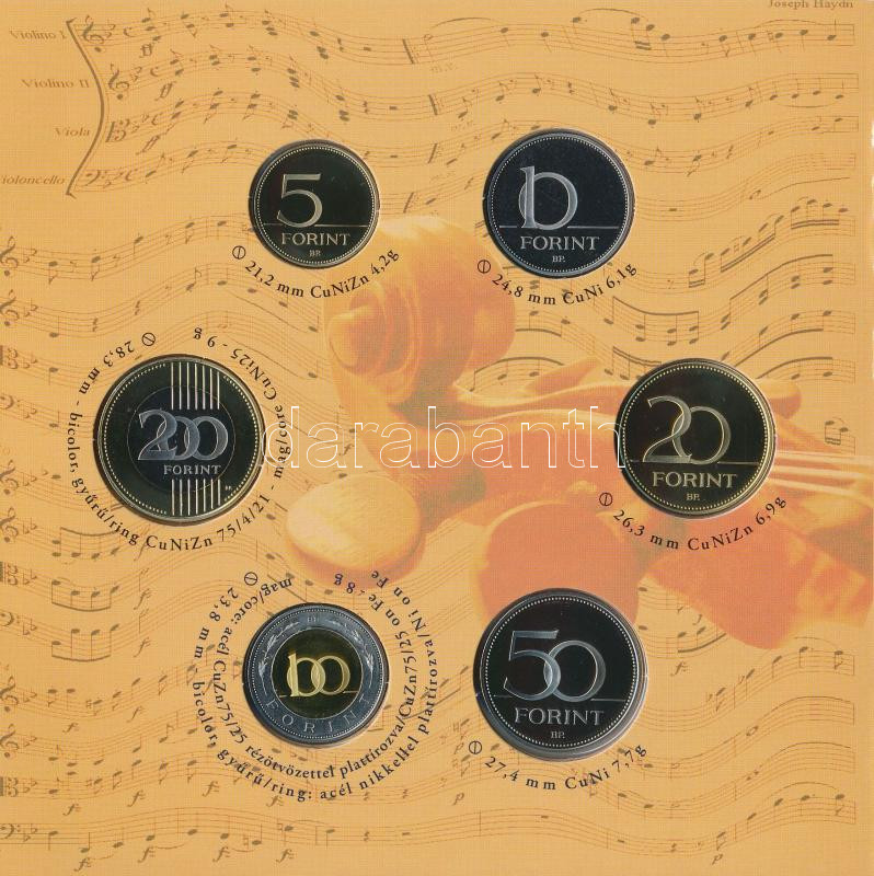 2009. 5Ft-200Ft "Haydn" 6klf darabból álló forgalmi érme sor... https://www.darabanth.com/de/265-Fernauktion/265.0/Numismatik/Ungarische-Munzen-und-Munzen-mit-ungarischem-Munzzeichen~400008/2009-5Ft-200Ft-Haydn-6klf-darabbol-allo-forgalmi-erme-sor-plus-Joseph-Haydn-Ag-emlekerem-12~II1306082