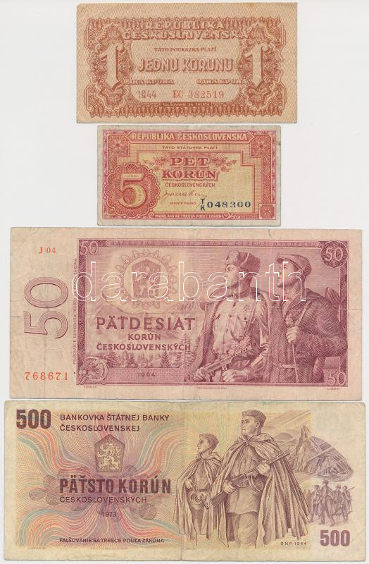 Czechslovakia 1944. 1 Korun + 1945. 5 Korun + 1964. 50 Korun + 1973. 500 Korun C:F,VG