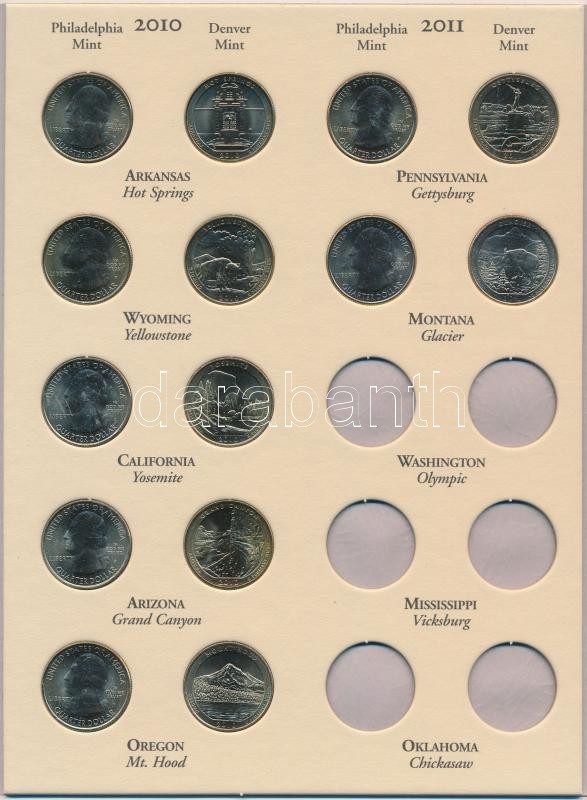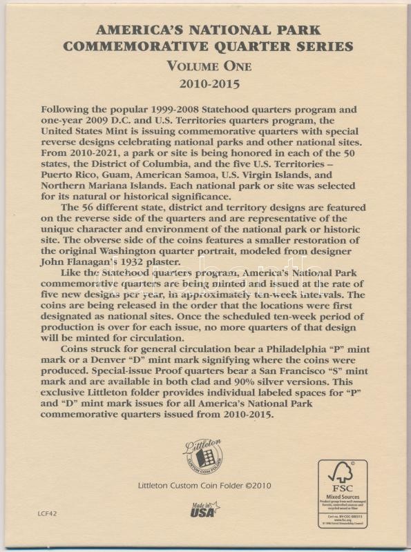 Amerikai Egyesült Államok 2010-2011. 1/4$ "Nemzeti Park" 14xklf "AMERICA'S NATIONAL PARK COMMEMORATIVE QUARTERS VOLUME ONE 2010-2015" gyűjtői albumba rendezve T:1,1-