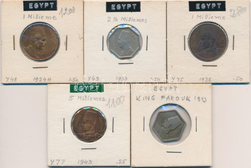 Egypt 1924. 1 Millieme Br + 1933. 2 1/2 Milliemes Cu-Ni "Fuad I" + 1938. 1 Millieme Br + 1943. 5 Milliemes Br + 1944. 2 Piastres Ag "Farouk" C:XF,VF
