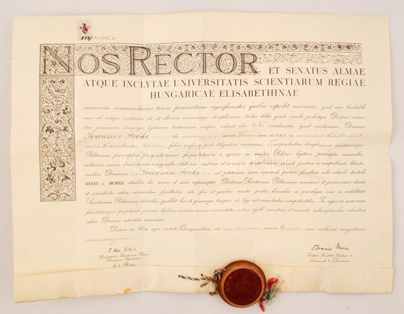 1938 Pécs, az Erzsébet Tudományegyetem politikatudományi doktori oklev... https://www.darabanth.com/de/266-Fernauktion/266.0/Andere-Sammelgebiete/Dokument~15/1938-Pecs-az-Erzsebet-Tudomanyegyetem-politikatudomanyi-doktori-oklevele-okmanybelyeggel-fa~II1332620