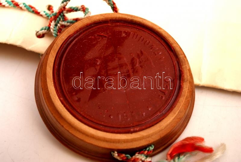 Beschreibung: 1938 Pécs, az Erzsébet Tudományegyetem politikatudományi doktori oklevele, okmánybélyeggel, fatokos függőpecséttel