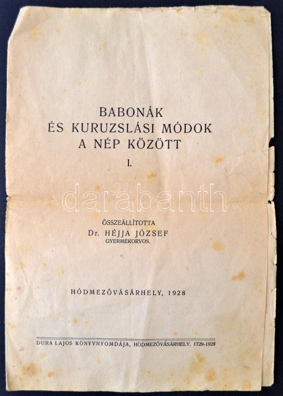 1928 Babonák és kuruzslási módok a nép között. I. 8p. https://www.darabanth.com/de/266-Fernauktion/266.0/Andere-Sammelgebiete/Drucksachen~25/1928-Babonak-es-kuruzslasi-modok-a-nep-kozott-I-8p~II1319070