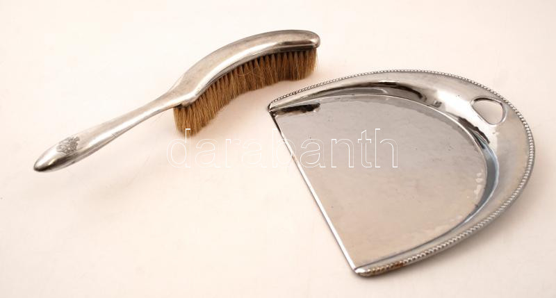 Beschreibung: Fém morzsalapát, balkezes címeres asztali seprűvel, 18,5×17 cm, h: 24,5 cm