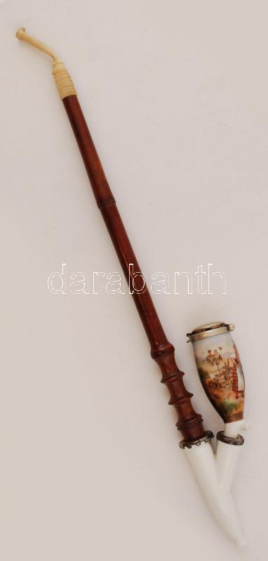 Beschreibung: Porcelán pipafej, fa szipkával, jó állapotban, h: 9, 10 és 35 cm, összesen 3 db
