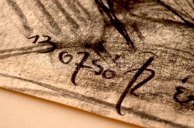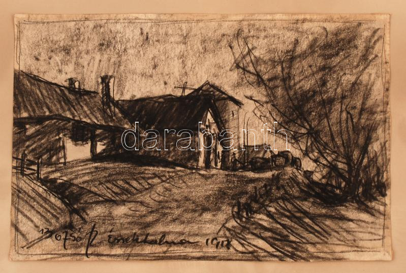 Beschreibung: Bozsó János (1922-1998): Érsekhalma. szeszfőzde. Szén, papír, jelzett, 18×28 cm