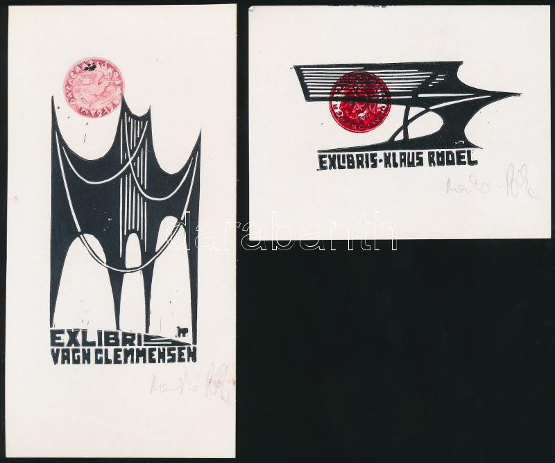 Beschreibung: Meskó Anna (1943-2010)- Pőka György (1944-):2 db exlibris 10 filléres nyomattal, linó, papír, jelzett, 9×5-4×7 cm