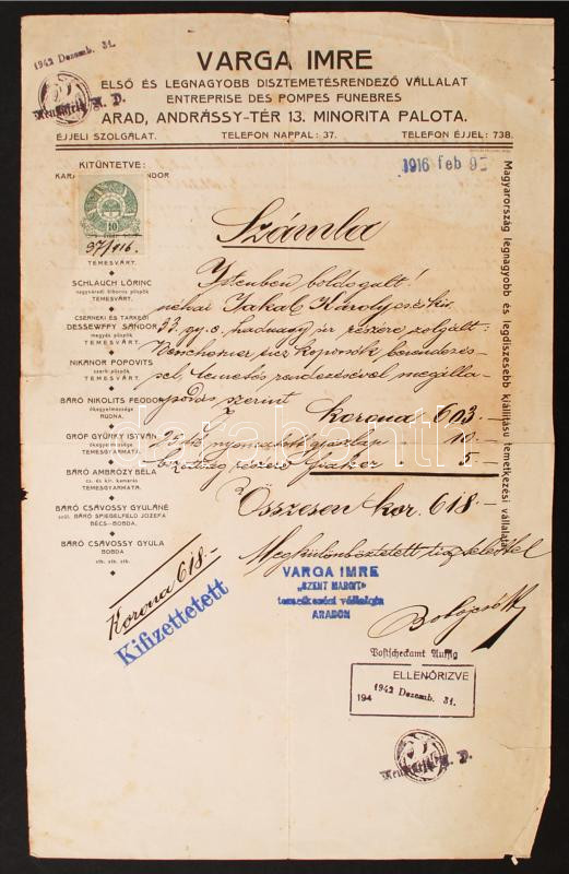 1916 Arad, Háborúban elhunyt hadnagy temetéséről kiállított fejléces s... https://www.darabanth.com/de/266-Fernauktion/266.0/Andere-Sammelgebiete/Militaria~23/1916-Arad-Haboruban-elhunyt-hadnagy-temeteserol-kiallitott-fejleces-szamla~II1333706