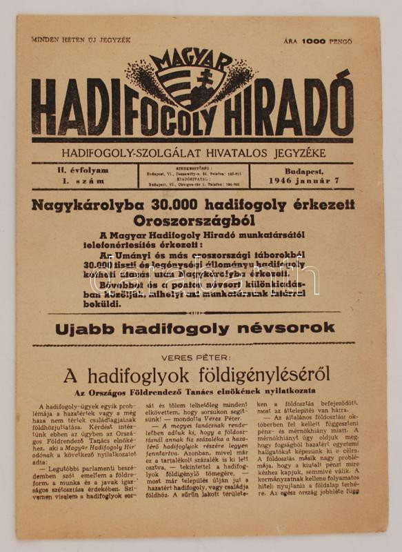 1946 Hadifogoly Híradó, II./1sz. az Umányi táborban lévő hadifoglyok e... https://www.darabanth.com/de/266-Fernauktion/266.0/Andere-Sammelgebiete/Militaria~23/1946-Hadifogoly-Hirado-II1sz-az-Umanyi-taborban-levo-hadifoglyok-egy-reszenek-nevsorav~II1330683