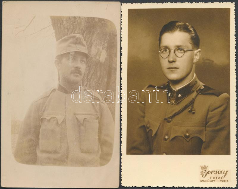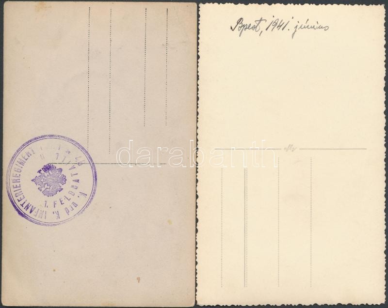Beschreibung: cca 1914-1918, 1941 Katonákról készült fotók, 2 db fotólap, egyik hátoldalon pecséttel jelzett(K.u.K. Infanterieregiment), másik dátumozva, 14x9 cm