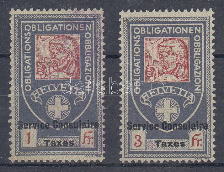 Beschreibung: 2 klf svájci konzulátusi illetékbélyeg 1Fr, 3Fr