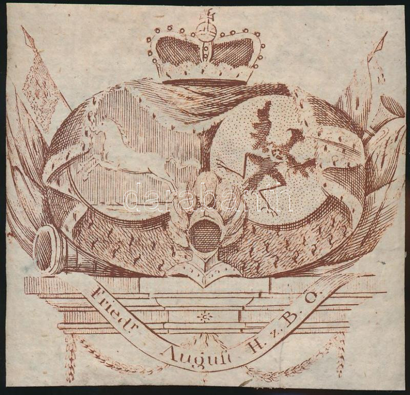 Frigyes Ágost (1740-1805) braunschweig-wolfenbütteli herceg ex librise. Fektetett ovális keretben a Braunschweigi hercegség, valamint a Oelsi hercegség címerállata. 1790 körüli készült rézmetszet / Etched bookplate of August Friedrich prince of Braunschweig-Wolfenbüttel 7x7 cm.