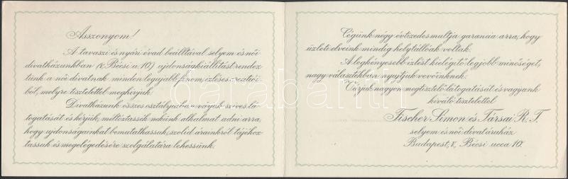 Fischer és Simon Divatházának reklámkártyája, a díjnyertes kirakat gra... https://www.darabanth.com/de/266-Fernauktion/266.0/Andere-Sammelgebiete/Werbungen~19/Fischer-es-Simon-Divathazanak-reklamkartyaja-a-dijnyertes-kirakat-grafikajaval-9x14-cm~II1333154