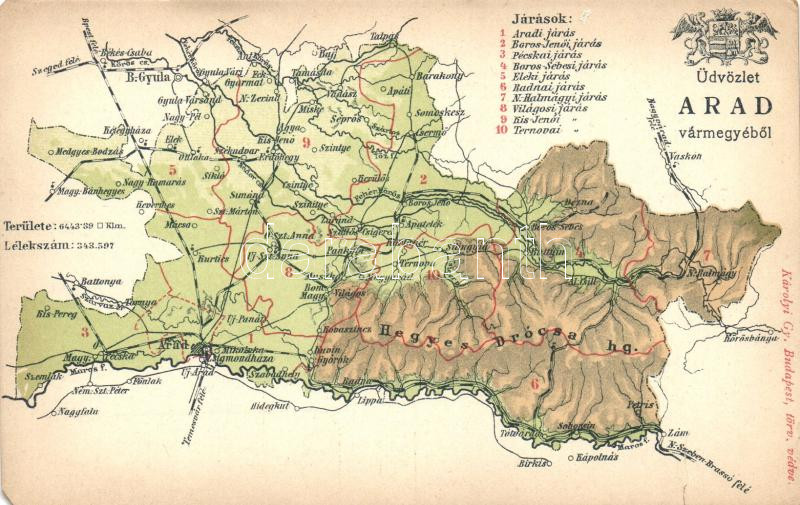 Arad Vármegye térképe, kiadja Károlyi Gy. / Hungarian county map (b) https://www.darabanth.com/de/266-Fernauktion/266.0/Ansichtskarten/Landkarte~300088/Arad-Varmegye-terkepe-kiadja-Karolyi-Gy-Hungarian-county-map-b~II1333865