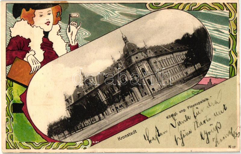 Brassó, Kronstadt, Brasov; Pénzügyi palota / Palace of Finance, Lady, ... https://www.darabanth.com/de/266-Fernauktion/266.0/Ansichtskarten/Siebenburgen~300058/Brasso-Kronstadt-Brasov-Penzugyi-palota-Palace-of-Finance-Lady-Art-Nouveau-litho~II1332808