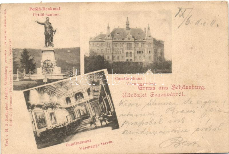 Segesvár, Schässburg; Petőfi-szobor, Vármegyeház, vármegye terem belső... https://www.darabanth.com/de/266-Fernauktion/266.0/Ansichtskarten/Siebenburgen~300058/Segesvar-Schassburg-Petofi-szobor-Varmegyehaz-varmegye-terem-belso-Verlag-von-H-G-Roth~II1333286