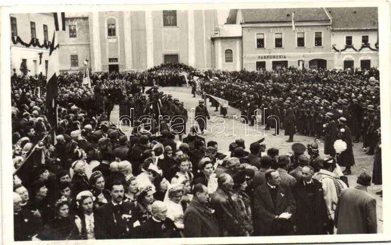 Beschreibung: 1938 Rozsnyó, Roznava; bevonulás, Tátra Bank, Parfüméria / entry of the Hungarian troops, bank, perfume shop, 'Rozsnyó visszatért' So. Stpl.
