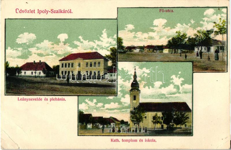 Ipolyszalka, Szalka, Salka; Fő utca, Leánynevelde, plébánia, Katolikus templom és iskola, kiadja Pummerschein György / main street, girl school, rectory, Catholic church and school (EK)