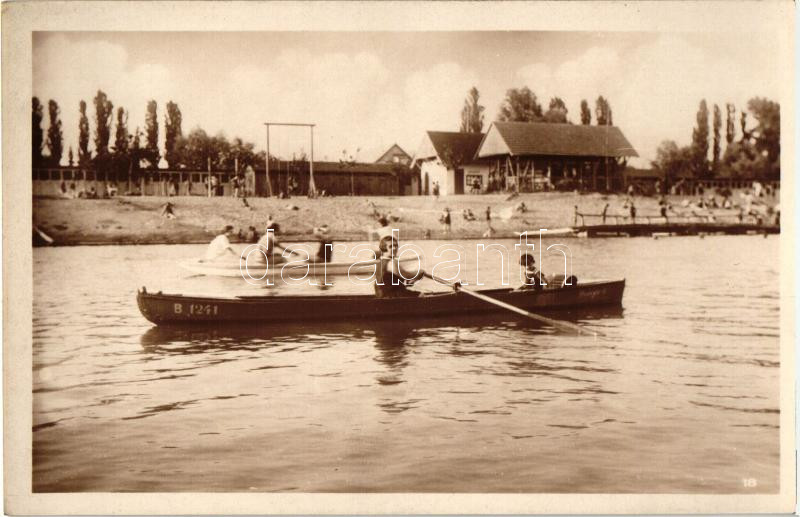Beschreibung: Baja, strandfürdő, evezősök csónakban