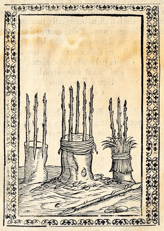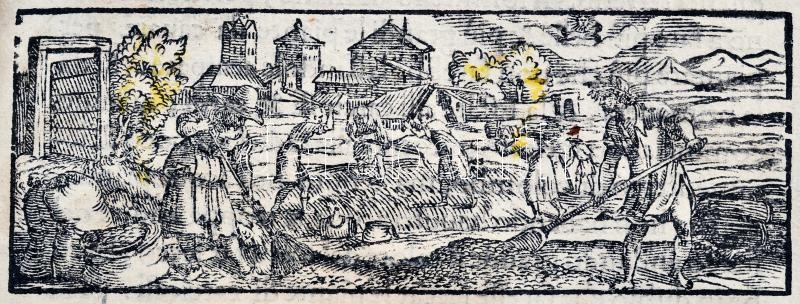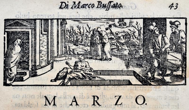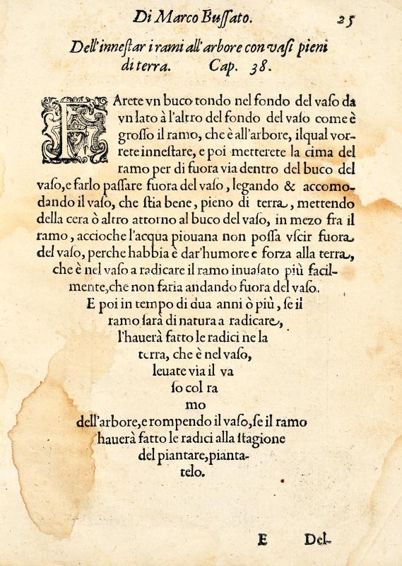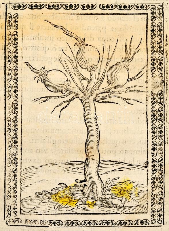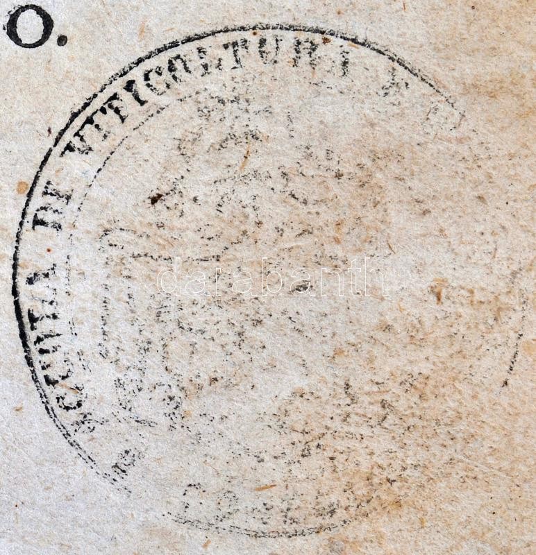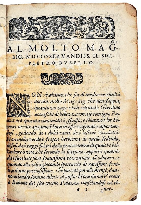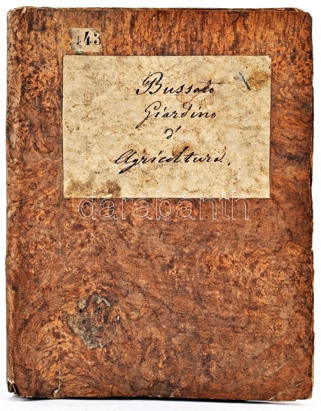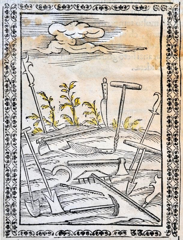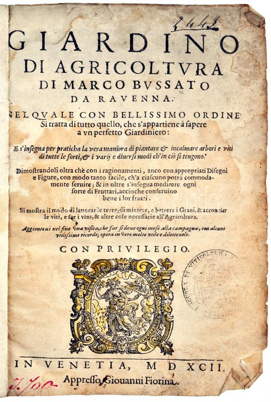Bussato [Bussatti] da Ravenna, Marco: Giardino di agricoltura. Venezia, 1592, Giovanni Fiorina. Olasz nyelvű mezőgazdasági traktátus, első kiadás. Papír, többféle (feltehetőleg észak-itáliai) vízjellel, 59 folio (ebből 53 számozott), az 1. folión a szöveget nem érintő hiánnyal, a 10. és 15. folio hiányzik, a 23. tévesen 21-nek számozva. 28 db metszettel. Papírkötésben, kissé vetemedett, korához képest jó állapotban. / Agricultural tractate in Italian, first edition. On paper, with various watermarks (most probably from Northern Italy), 59 folios, 53 numbered, the 1st with some damage which doesn't affect the text itself; the 10th and 15th folios are missing and the 23th erroneously given as 21st. With 28 engravings. In paper binding, a bit warped but otherwise in good condition regarding its age.