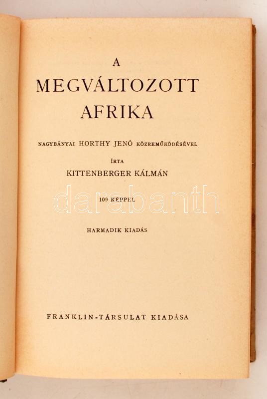 Kittenberger Kálmán: A megváltozott Afrika. Nagybányai Horthy Jenő közreműködésével. Bp., 1934, Franklin. 374 p. 40 t. Harmadik kiadás. Kiadói, aranyozott félvászonkötésben.