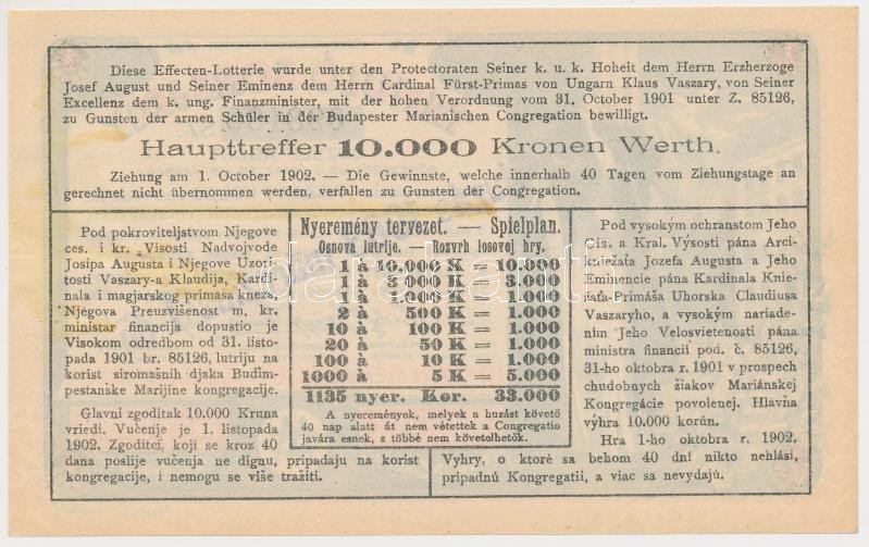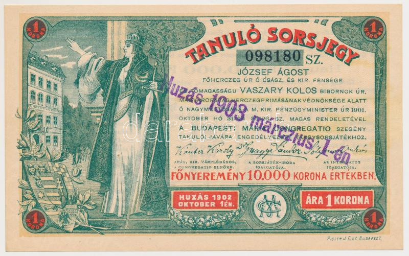 Beschreibung: 1903. "Tanuló Sorsjegy" 1K értékben, felülbélyegzéssel T:I- kis szennyeződés